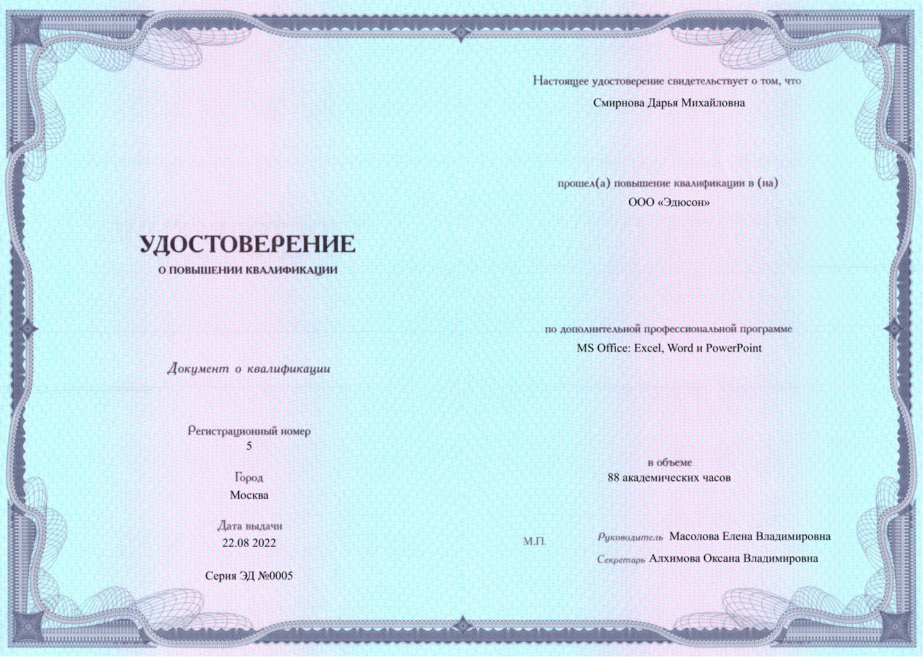 Образовательная деятельность в Академии Eduson (Общество с ограниченной ответственностью «Эдюсон») ведется на основании государственной лицензии №00374370 от 27 мая 2022 года. У вас будет официальный документ, который подтвердит повышение квалификации