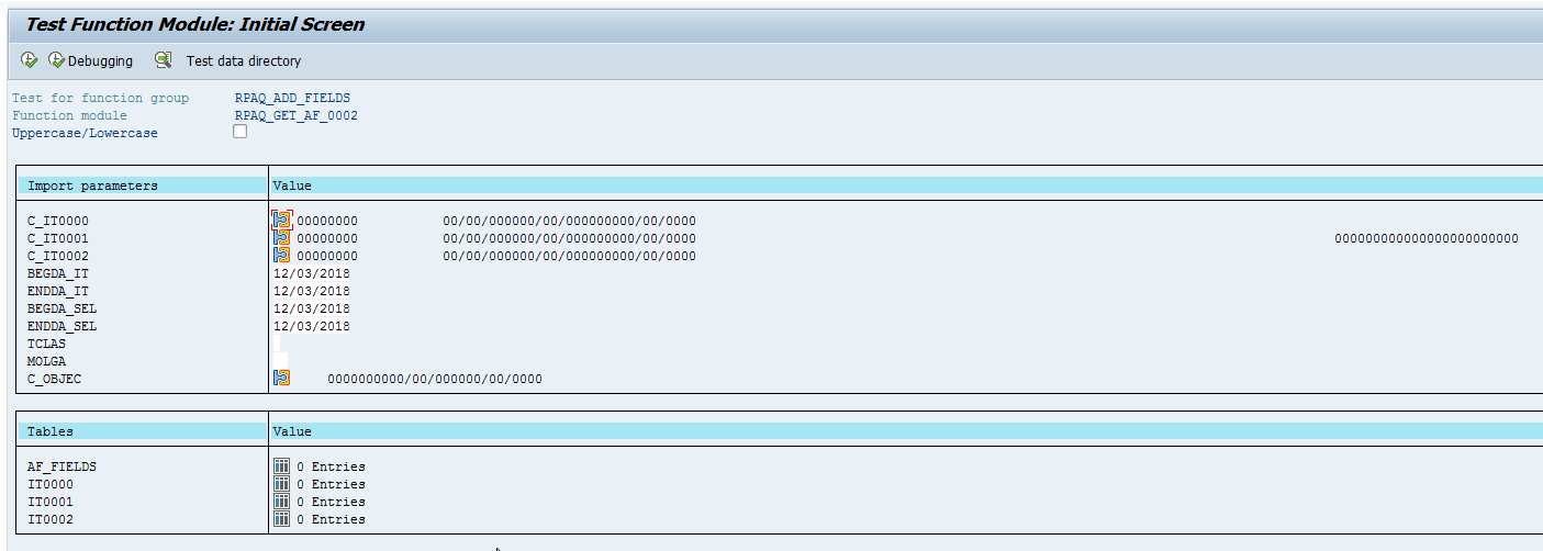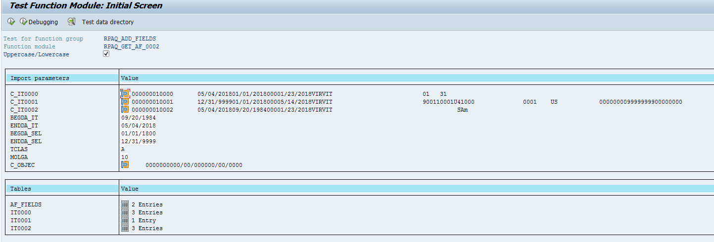 Я запустил отчет по дням рождения сотрудников. Мне надо, например, отладить ФМ RPAQ_GET_AF_0002. Я зашел внутрь модуля и перешел на закладку Locals.