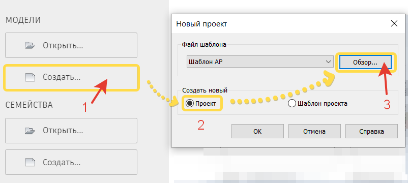 Чтобы его создать, необходимо в Проектах выбрать Создать – Рис. 3, и, в открывшемся окне, выбрать Обзор и затем указать путь нашего шаблона.