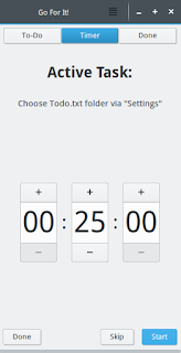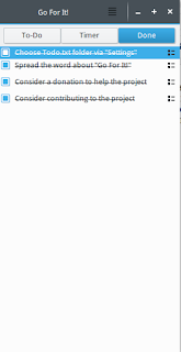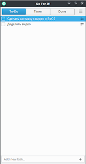 Go for It! — относительно молодая программа для ведения списка задач. Написана на GTK 3/Vala, потому идеально интегрируется в графическую среду GNOME. В отличии от Tasque не поддерживает сортировку задач и их распределение по времени. Имеет в себе таймер, с помощью которого можно указать время выполнения задачи.