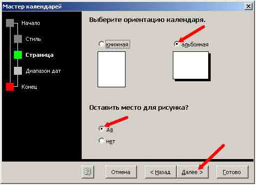 В новом окне необходимо выбрать ориентацию календаря, и выбрать будет на нашем календаре рисунок или нет.