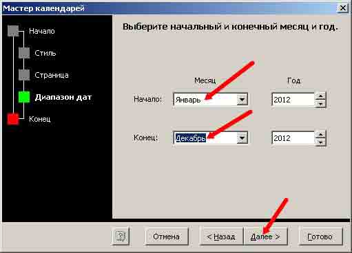 В следующем окне Мастера календарей необходимо выбрать начало и конец календаря. Ну, хотя нам и предсказывают конец Света, а я не из потомков Майя, всё же рискну всё-таки выбрать конечной – 31 декабря 2012 года. Авось, мои предсказания более правильные.