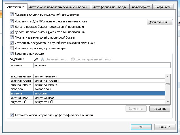 Появится диалоговое окно с активированной вкладкой Автозамена. Эта вкладка содержит перечень всех замен, а также список корректировок обычных опечаток. Через эту вкладку вы также можете удалить все варианты автозамены, которые вам не подходят.