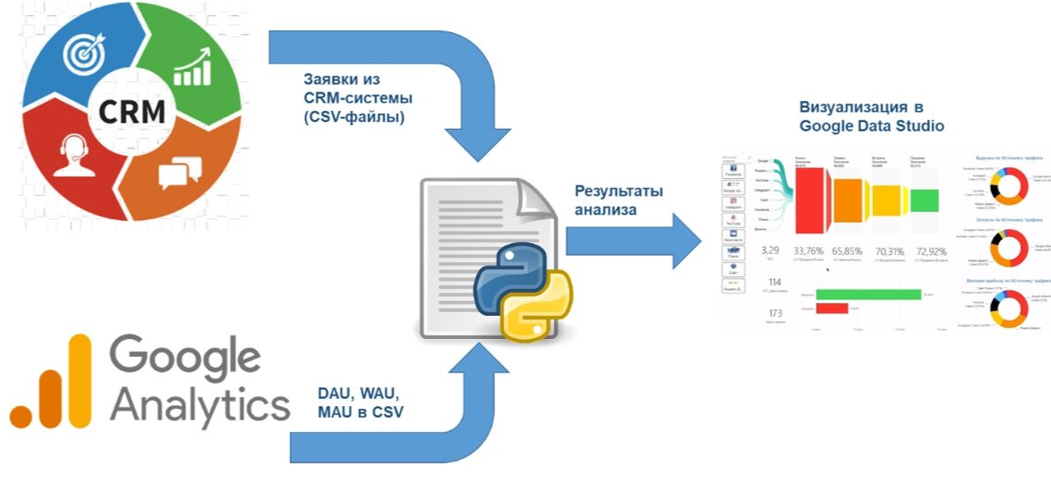 Ещё один хороший кейс — анализ конверсии сайта. Я получала заявки из CRM-системы в виде CSV-файлов и данные из Google Adwords в этом же формате. Для проверки гипотезы, как связано количество посещений (DAU-метрика) с заявками в этот день, даже пришлось вручную написать небольшой Python-скрипт. Визуализацию результатов можно сделать в дашборде BI-системы или комплексном инструменте аналитики (например, Google Data Studio).