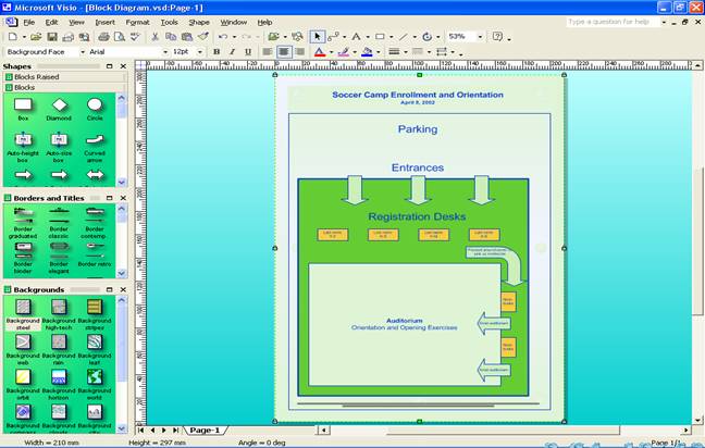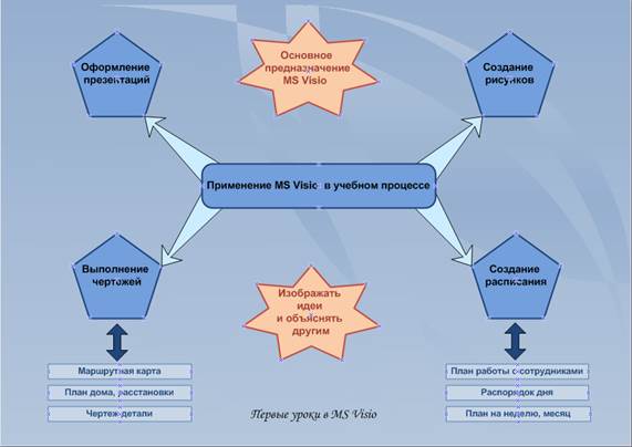 Программа Microsoft Visio специально разработана для ускорения и облегчения процесса создания графических документов. Она позволяет строить изображения из «кирпичиков», т.е. заранее заготовленных базовых элементов различной сложности от линий и многоугольников до радиодеталей и конструкций зданий. Программа содержит множество готовых для использования изображений объектов, делающих ее пригодной для применения в широком спектре деятельности человека, например создания диаграмм, блок-схем, электрических схем, планировка офисов и жилья, схематическое изображения баз данных и многое другое. Еще более расширяется круг приложения данного программного продукта возможностью создания собственных графических заготовок и объединения их в переносимые библиотеки. Microsoft Visio входит в пакет программ «Microsoft Office», что дает целый ряд достоинств: возможность экспорта созданных изображений в другие документы; знакомый интерфейс программы, а, следовательно, и легкость в ее освоении.