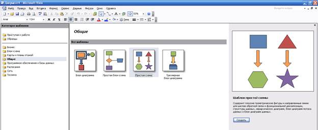 Теперь создайте новый документ(см. справку Создание нового документа). Для этого в левом окне выберите группу шаблонов Общие, а затем в окне Образцы щелкните по шаблону Простая схема.