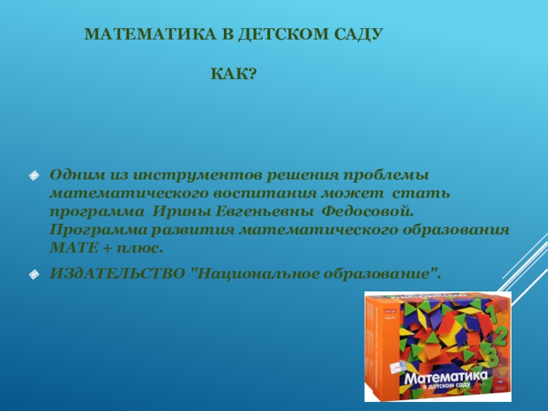 Математика в детском Саду Как?Одним из инструментов решения проблемы математического воспитания может стать программа Ирины Евгеньевны Федосовой. Программа развития математического образования МАТЕ + плюс.ИЗдАТЕЛЬСТВО «Национальное образование».