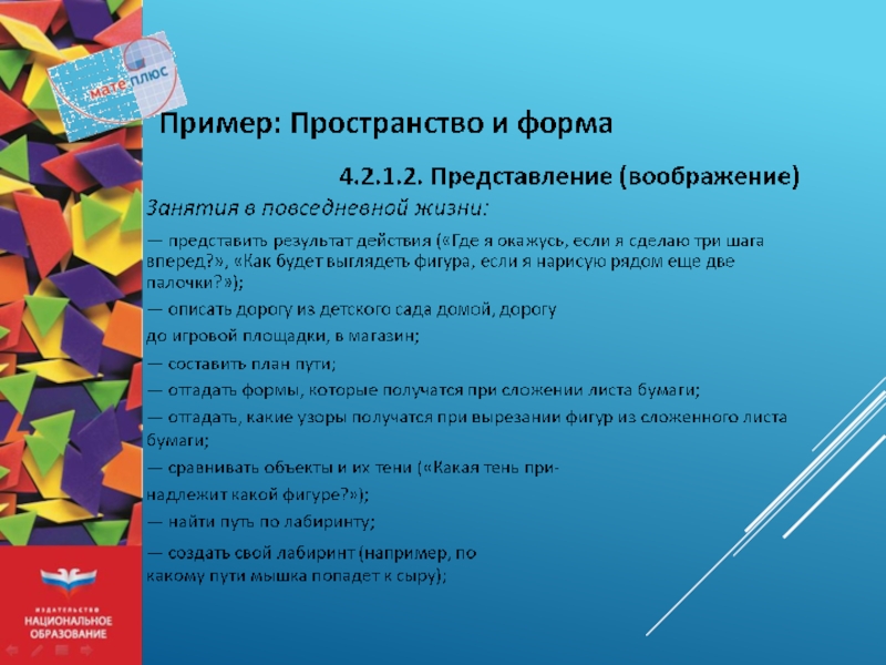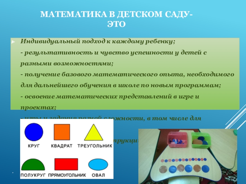чувство успешности у детей с разными возможностями; — получение базового математического опыта, необходимого для дальнейшего обучения в школе по новым программам; — освоение математических представлений в игре и проектах; — игры и задания разной сложности, в том числе для одаренных детей; — ясные рекомендации, инструкции и материалы для взрослых.