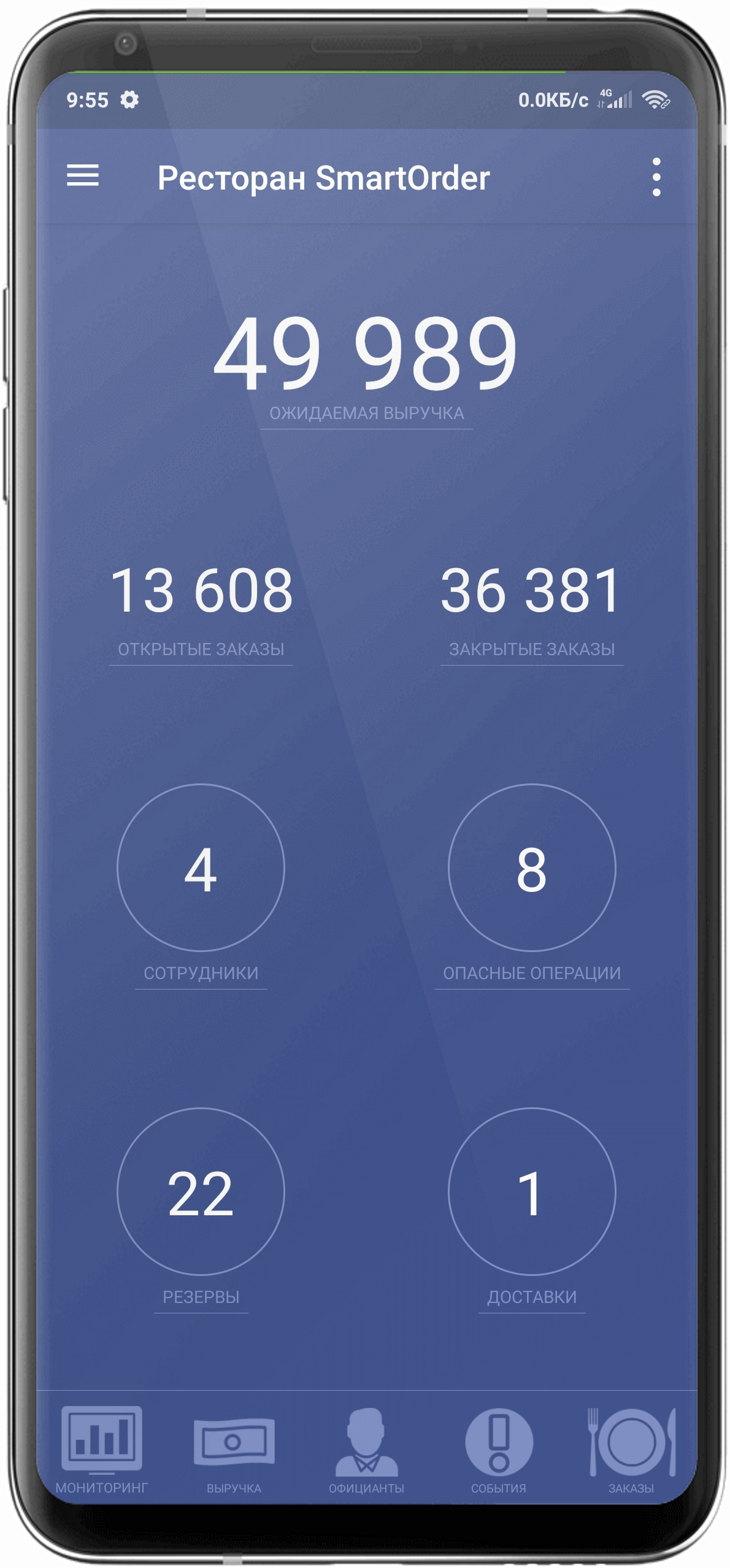 Оперативная информация о работе вашего ресторана. Этот замечательный инструмент позиционирован на достаточно большой круг сотрудников, это может быть владелец своего бизнеса, который хочет в режиме реального времени контролировать ситуацию или управляющий ресторана, добросовестно исполняющий свои обязанности. Это может быть даже менеджер на своем рабочем месте. Пользуясь нашим мобильным приложением SmartControl вы перемещаетесь в пространстве, и при этом всегда знаете о своем ресторане ВСЕ!