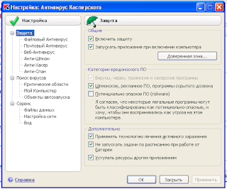 Открывшееся окно Настройка предназначено для настройки параметров работы антивируса.