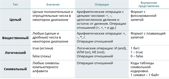К основным типам данных относятся целый, вещественный, логический и символьный типы. Типы данных различаются между собой по трём критериям: множество допустимых значение, множество допустимых операций, форма внутреннего представления. Все эти свойства предоставлены в таблице на экране.