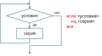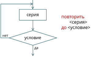 А при цикле с постусловием сначала идёт серия, а затем условие. Серия будет выполняться до тех пор, пока условие ложно. В данном цикле серия выполнится хотя бы один раз, прежде чем программа приступит к проверке условия.