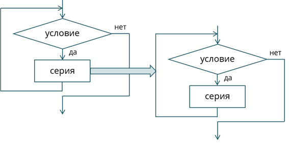 До этого мы с вами рассматривали базовые структуры. Сложный же алгоритм состоит из соединённых между собой базовых структур. Между собой эти структуры могут соединяться двумя способами: последовательным и вложенным.