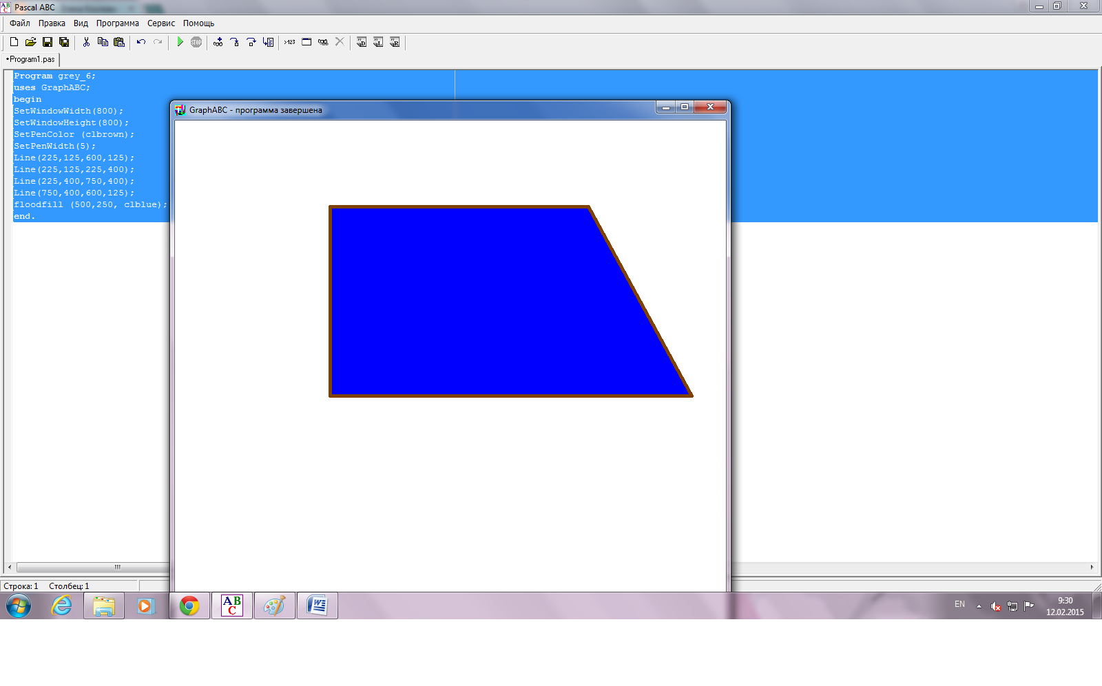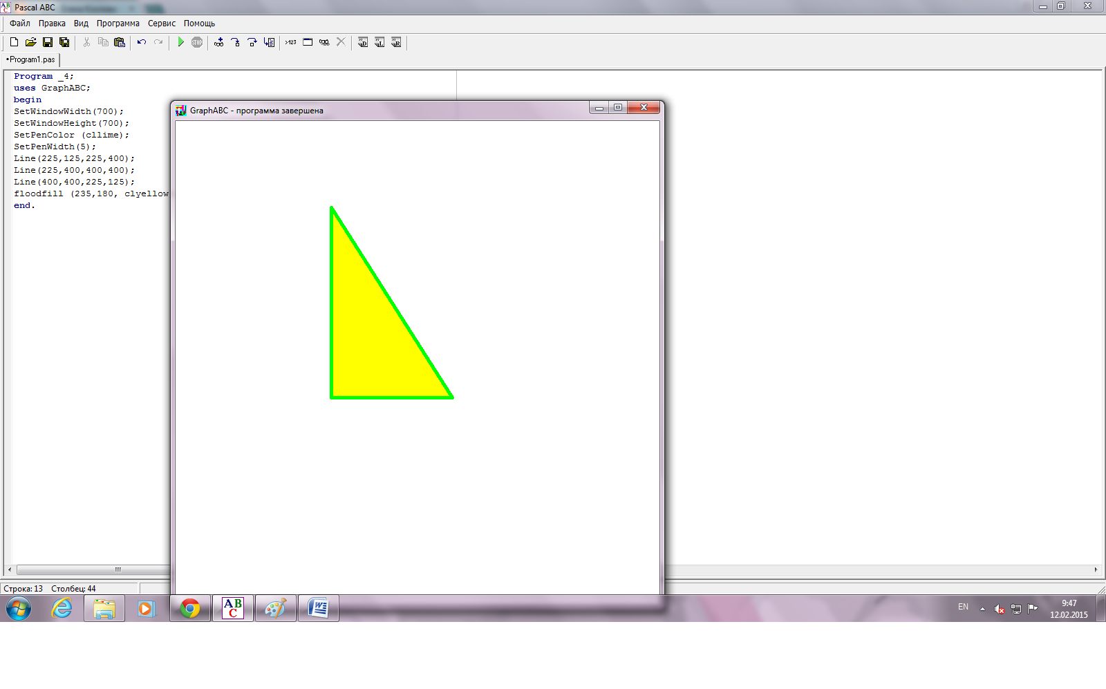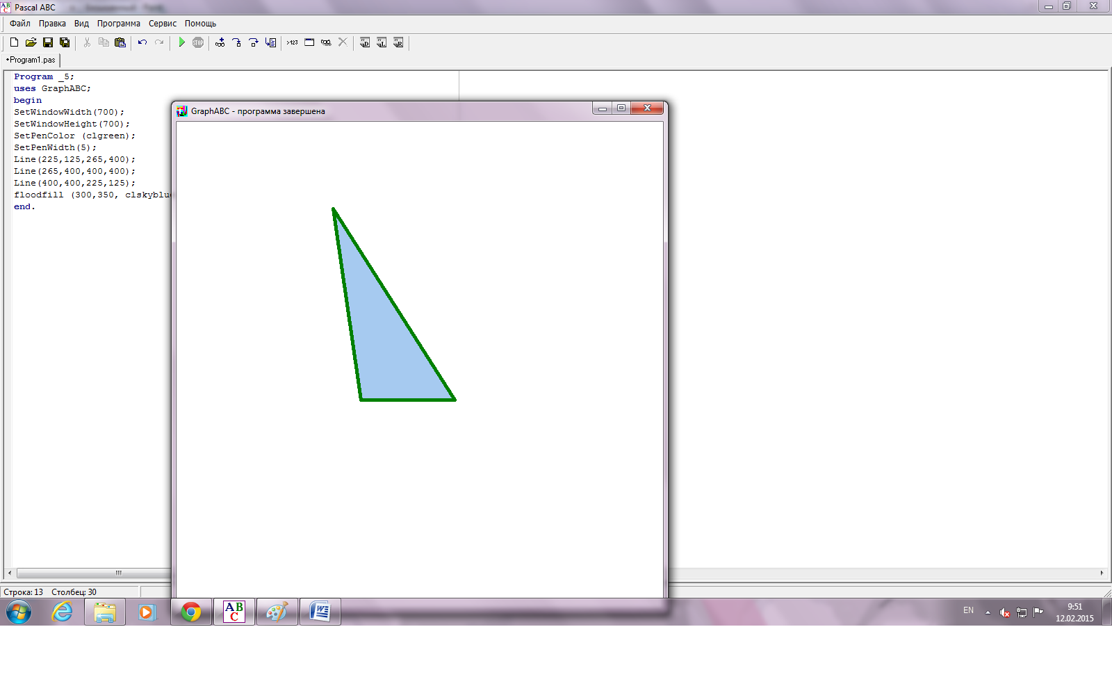 writeln(‘Vvedite koordinaty levogo kolca, x=[50..300], y=[50..350]:’);