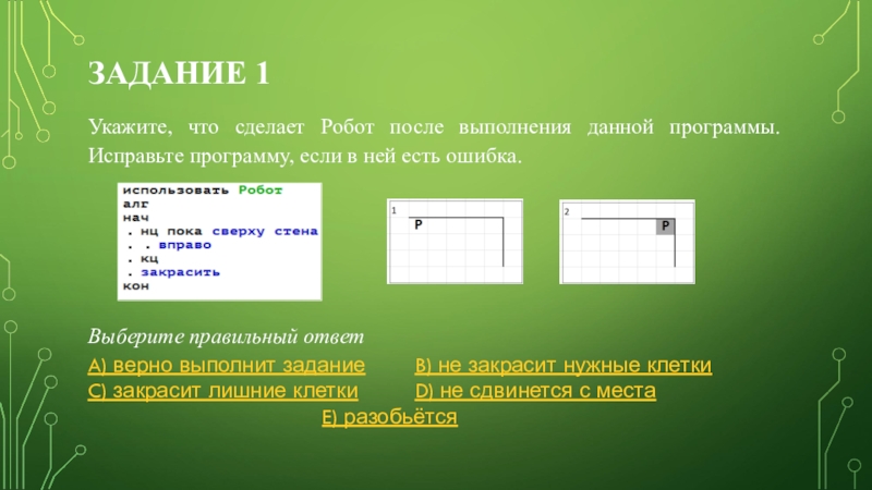 Укажите, что сделает Робот после выполнения данной программы. Исправьте программу,