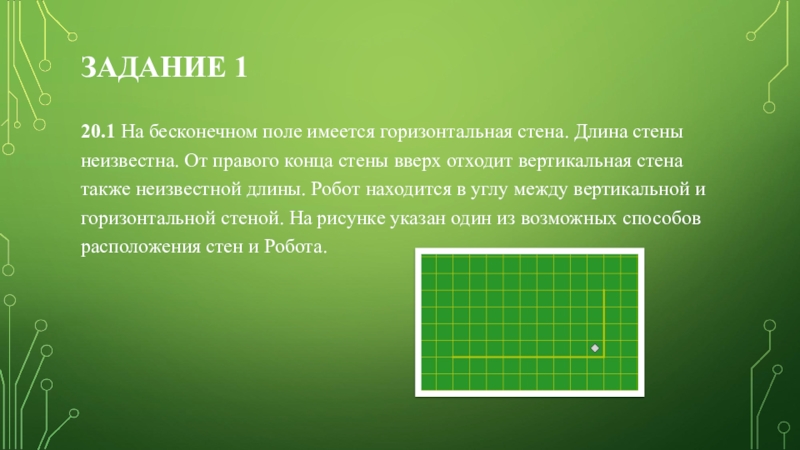 верхнего конца стены вправо отходит горизонтальная стена, и от нижнего конца стены вправо отходит горизонтальная стена также неизвестной длины. Робот находится в клетке, примыкающей сверху к нижней горизонтальной линии. На рисунке указан один из возможных способов расположения стен и Робота.