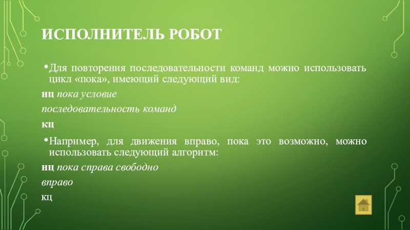 Для повторения последовательности команд можно использовать цикл «пока», имеющий следующий вид: