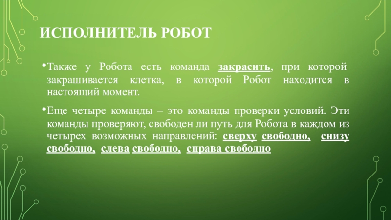 Ещё четыре команды – это команды проверки условий. Эти команды проверяют, свободен ли путь для Робота в каждом из четырёх возможных направлений:
