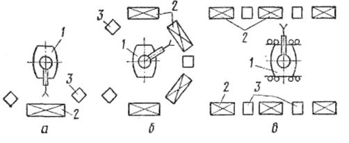 3.81, в). Робот перемещает заготовки из накопителя (магазина) 3 к станкам и между станками. Во всех случаях — это автоматизированный участок, на котором автоматизированы все основные и вспомогательные операции. При обеспечении таких участков системами транспортировки и складирования заготовок с общей диспетчеризацией управления на базе ЭВМ воспроизводится гибкая производственная система.