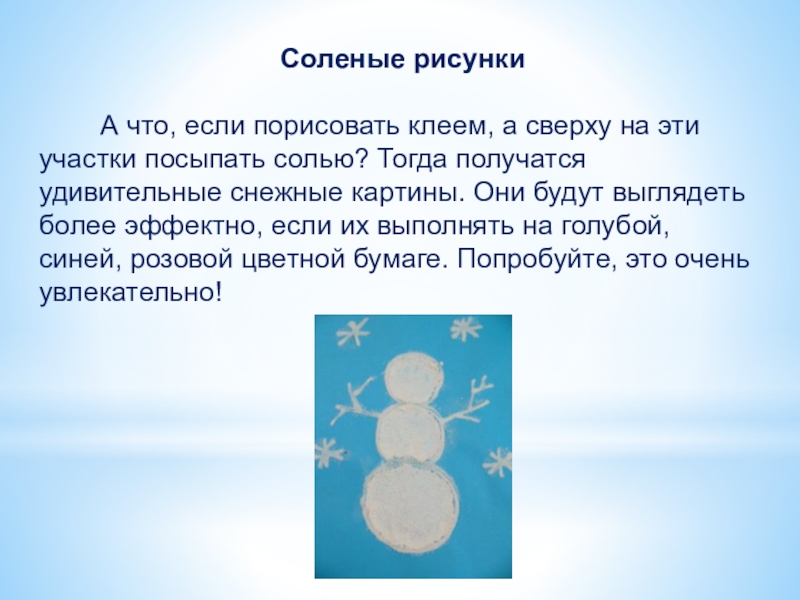 порисовать клеем, а сверху на эти участки посыпать солью? Тогда получатся удивительные снежные картины. Они будут выглядеть более эффектно, если их выполнять на голубой, синей, розовой цветной бумаге. Попробуйте, это очень увлекательно!