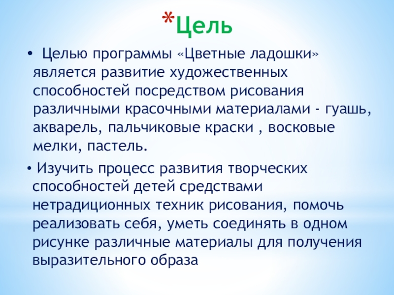 Целью программы «Цветные ладошки» является развитие художественных способностей посредством рисования различными красочными материалами — гуашь, акварель, пальчиковые краски , восковые мелки, пастель.