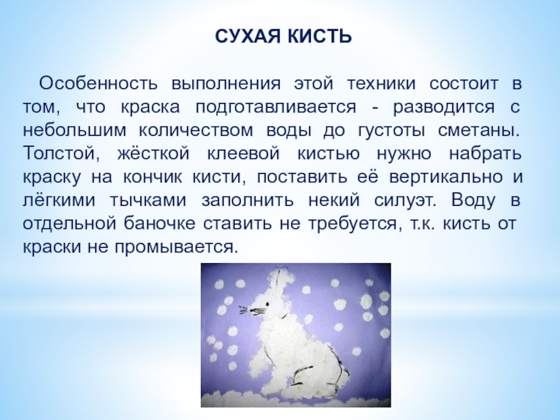 Увлекательное занятие! Наберём краски и лёгкими прикосновениями к бумаге будем рисовать что-нибудь пушистое, лёгкое, воздушное, прозрачное. Можно сочетать эту технику с техникой «Трафарет»