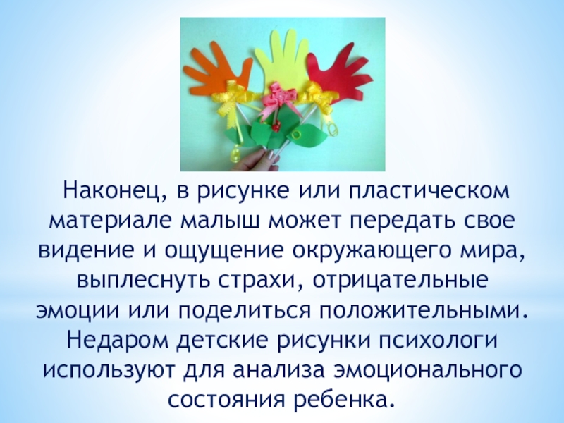 Слайд 19 Наконец, в рисунке или пластическом материале малыш может передать свое