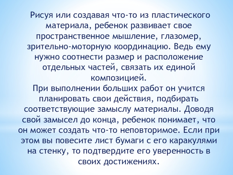 Слайд 18 Рисуя или создавая что-то из пластического материала, ребенок развивает свое