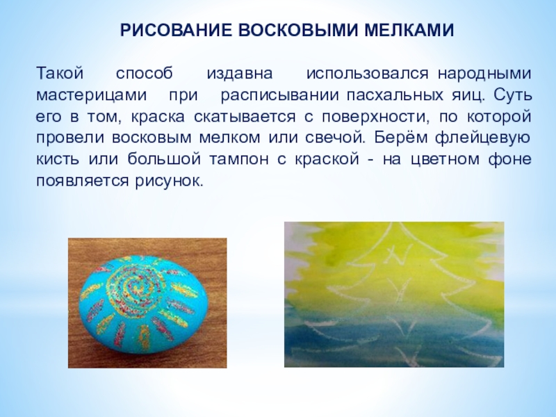 мастерицами при расписывании пасхальных яиц. Суть его в том, краска скатывается с поверхности, по которой провели восковым мелком или свечой. Берём флейцевую кисть или большой тампон с краской — на цветном фоне появляется рисунок.