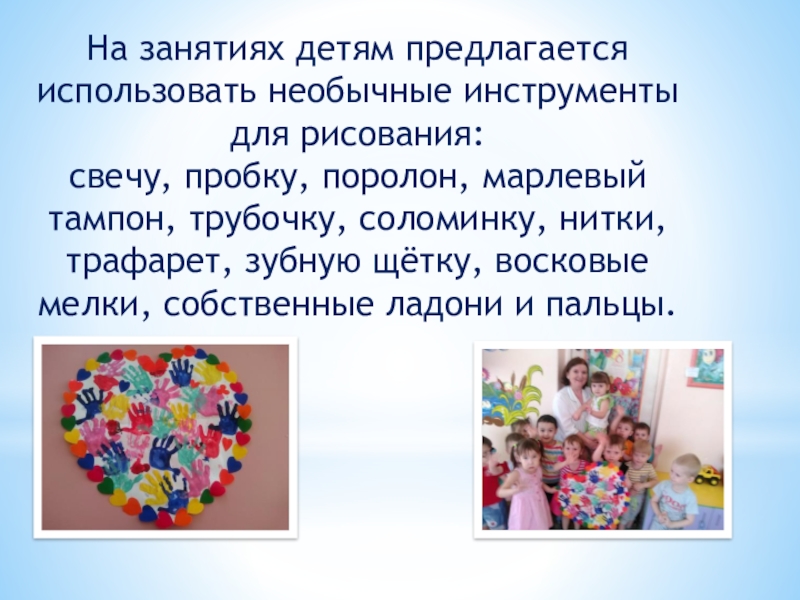 Слайд 7На занятиях детям предлагается использовать необычные инструменты для рисования: