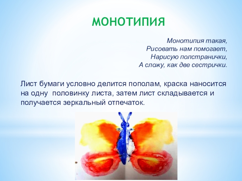 условно делится пополам, краска наносится на одну половинку листа, затем лист складывается и получается зеркальный отпечаток.