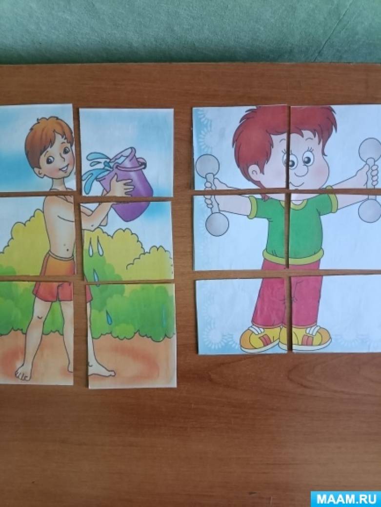 Инвентарь: макеты продуктов, разрезные картинки (пазлы) по теме здоровье, «градусник» — 2 шт., музыкальное сопровождение.