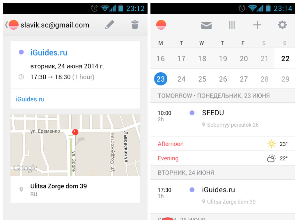 Не хочется вас утомлять дифирамбами в сторону дизайнеров, но они постарались на славу. Интерфейсом Sunrise можно любоваться долго, мелочам уделено большое внимание. Помимо предстоящих событий на текущую дату, вам будет предложен прогноз погоды. Некоторые зарубежные пользователи сетуют на невозможность пролистывания календаря более чем на год вперед. Наверное, с таким серьезным графиком занятости стоит нанять себе секретаря.