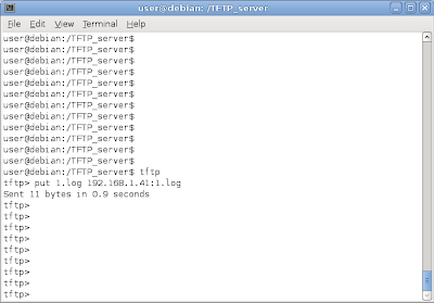 В заключение попробуем записать файлы на TFTP сервер виртуальной машины 1 используя клиент виртуальной машины 3 с Debian . Для этого выполним на ней следующие команды: