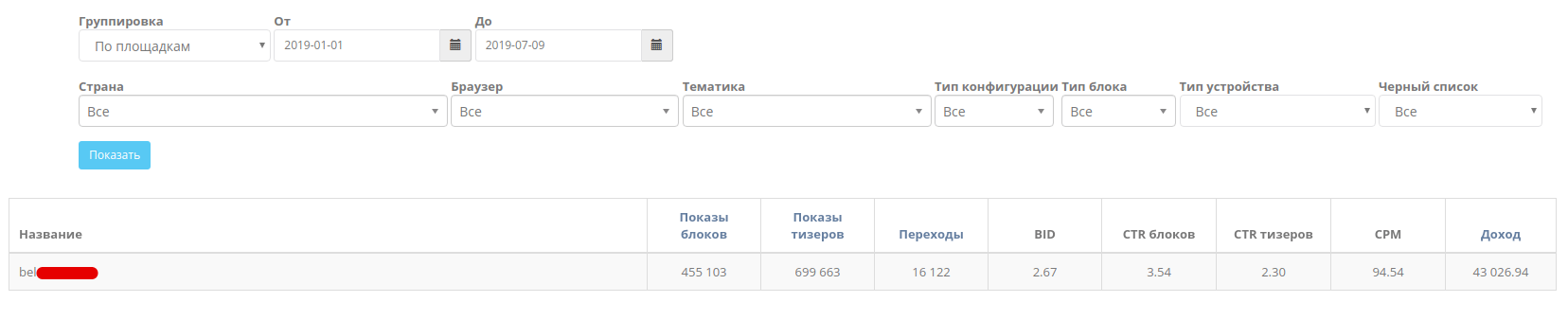 - Статистика эффективности. Фильтрация по периоду, сайту, отслеживание количества кликов и показов.