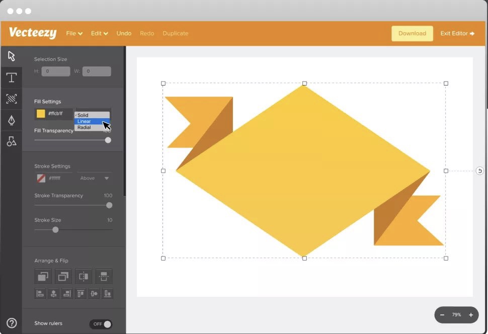 Vecteezy – бесплатный онлайн-редактор в браузере, который позволяет любому пользователю быстро и легко создавать красивую графику. Инструмент встроен в базу данных бесплатной векторной графики в интернете. В нём можно легко настроить любой файл перед загрузкой в формате SVG, PNG или JPG. Вам лишь необходимо создать учетную запись, чтобы сохранить свою работу, а присоединение к профессиональной версии дает множество дополнительных инструментов и ресурсов.