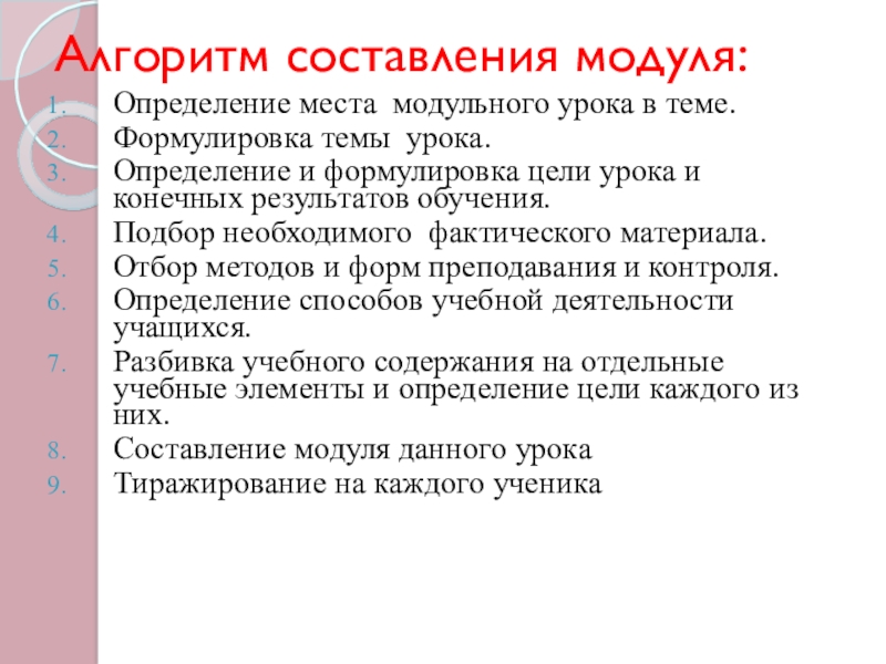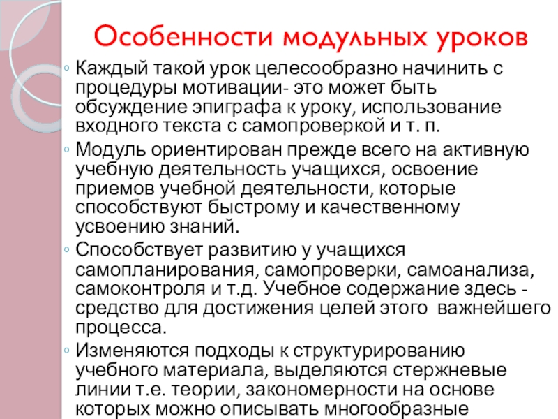 При модульном обучении цели формируются в терминах методов деятельности и способов действий обучающихся.