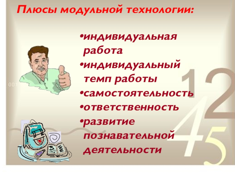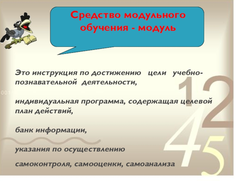 Основная идея модульного обучения состоит в следующем: обучающийся должен учиться сам, а учитель — осуществлять управление обучением и создавать условия для его учения.
