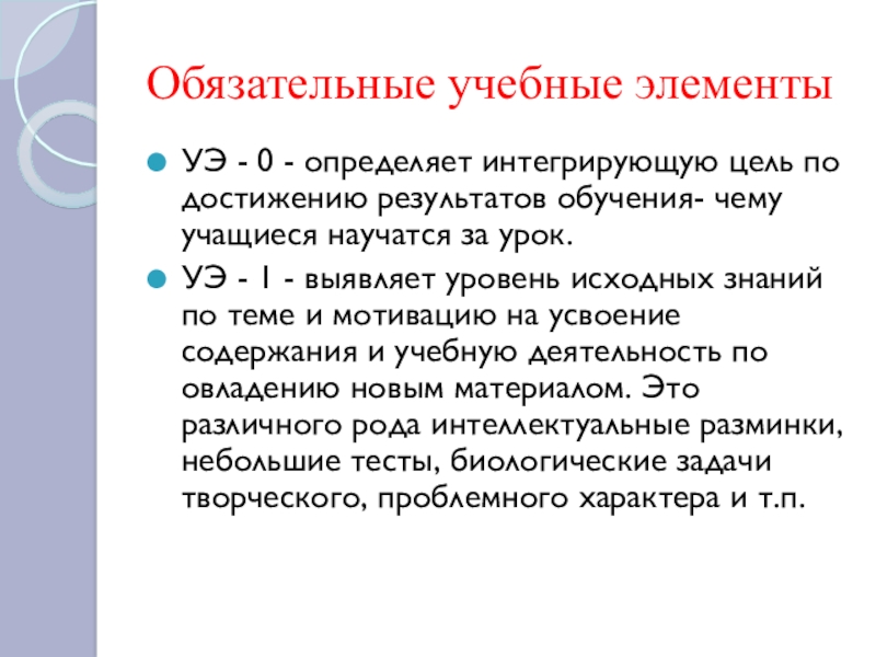 УЭ — 1 — выявляет уровень исходных знаний по теме и мотивацию на усвоение содержания и учебную деятельность по овладению новым материалом. Это различного рода интеллектуальные разминки, небольшие тесты, биологические задачи творческого, проблемного характера и т.п.