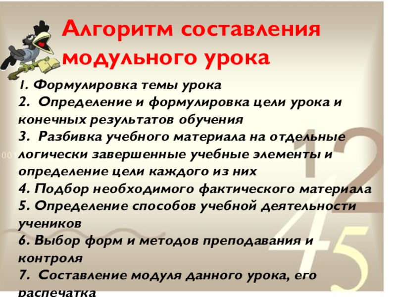 2. Каждый модуль имеет интегрирующую дидактическую цель, которая делится на частные дидактические цели (цели учебных элементов модуля).