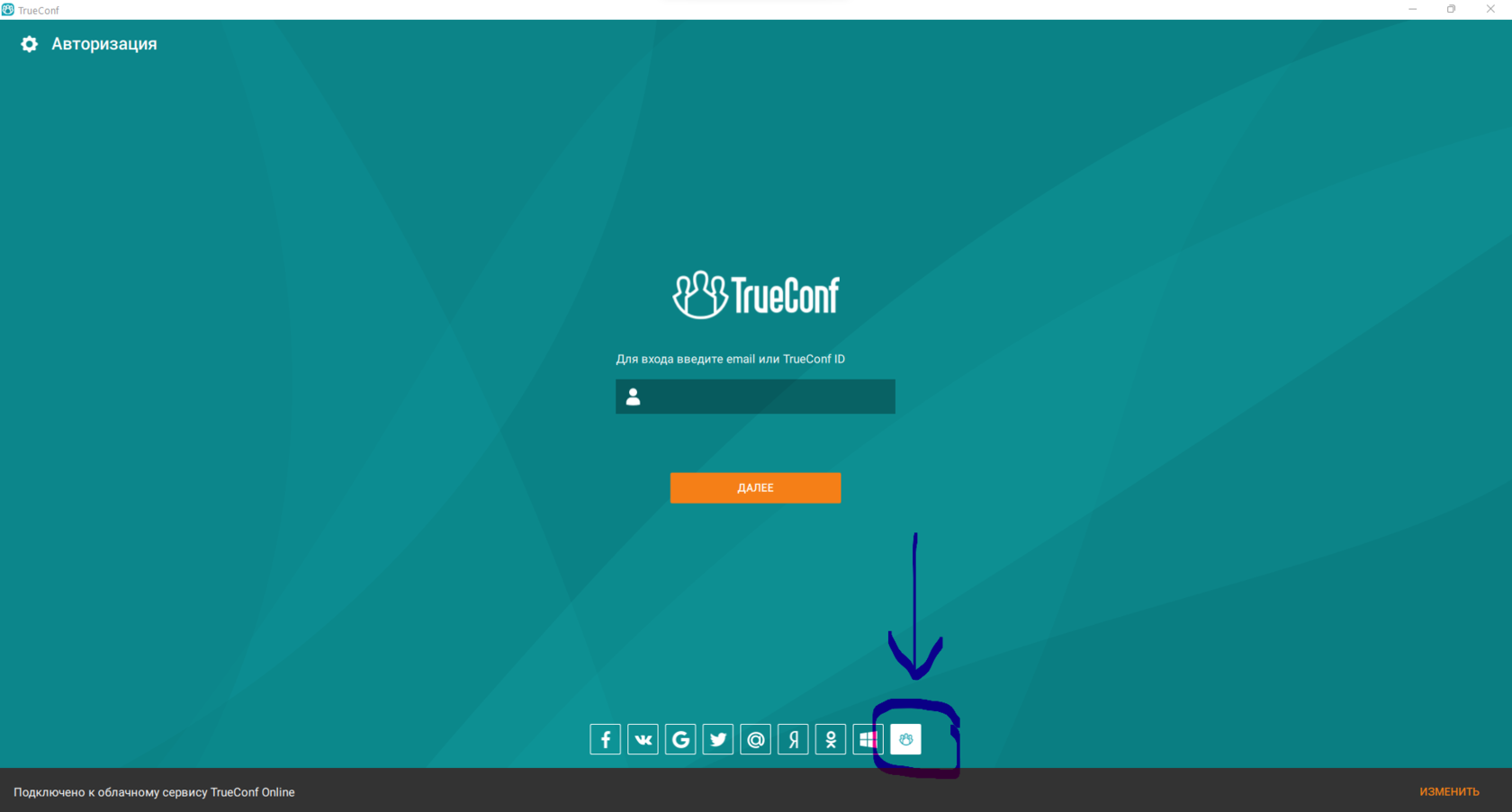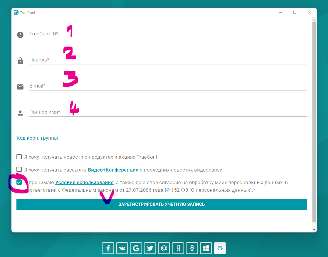 При запуске приложение будет требовать авторизацию на сервисе. Но в самом начале у вас еще нет там аккаунта и для начала нужно зарегистрироваться на сервисе. Для этого нужно кликнуть на иконку TrueConf, см. скриншоты.