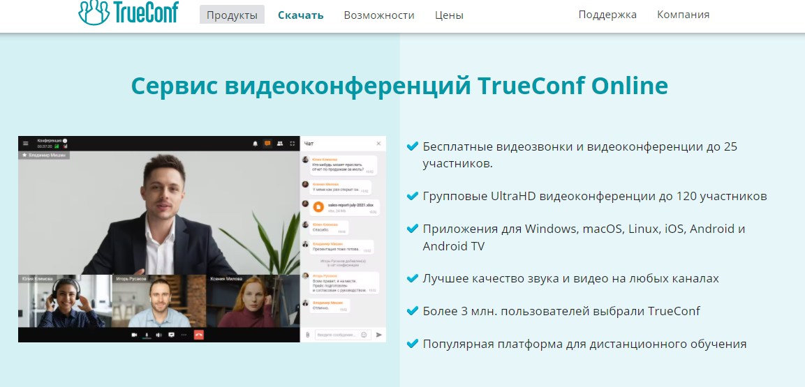 TrueConf – отечественный сервис для организации видеоконференцсвязи, голосовых вызовов, обучающих семинаров, текстового чата между участниками, зарегистрированными на определенном сервере. Во многом – аналог Skype.