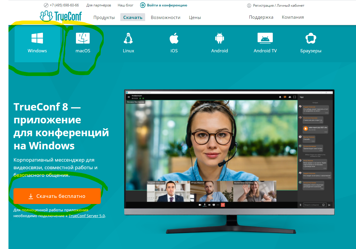 Страница скачивания клиентского приложения TrueConf: