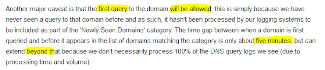 Неизвестные DGA домены Umbrella детектит только как «Newly seen domains», куда попадает масса всего легитимного, поэтому Cisco сама рекомендует не блокировать эту категорию. Никаких алгоритмов оценки энтропии домена в реальном времени нет. Cisco уверяет, что они делают анализ DGA алгоритмов известной малвари на этапе расследования инцидентов. Но это поздно.