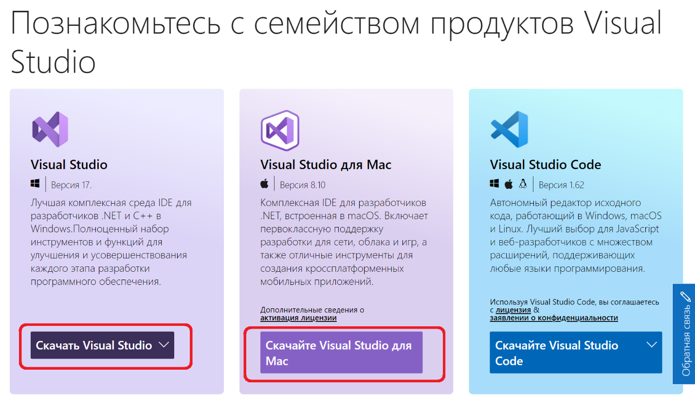 Переходим по ссылке на сайт разработчика https://visualstudio.microsoft.com/ru/. Выбираем версию согласно операционной системе (Mac OS или Windows).