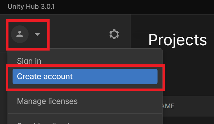 9. Откроется окно программы Unity Hub, необходимо зарегистрироваться и получить лицензию на использование Unity. В левом верхнем углу выбираем учетную запись и нажимаем «Create account» (создать аккаунт).