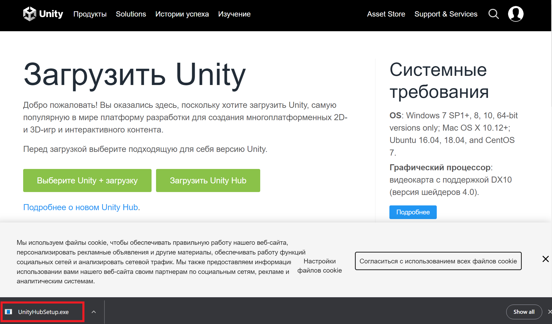 Для того, чтобы поставить Юнити через Hub, требуется: