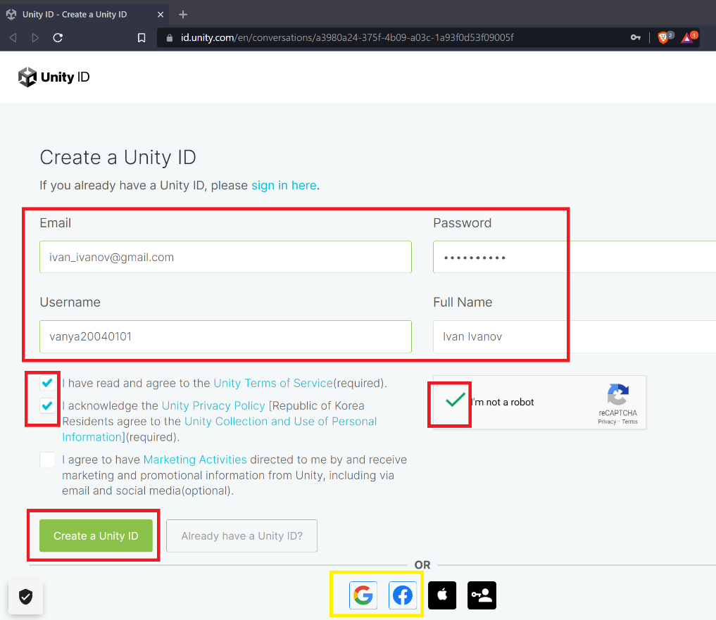 Ставим галочку «I acknowledge the Unity Privacy Policy (required)» (Я признаю политику приватности юнити (обязательно)).