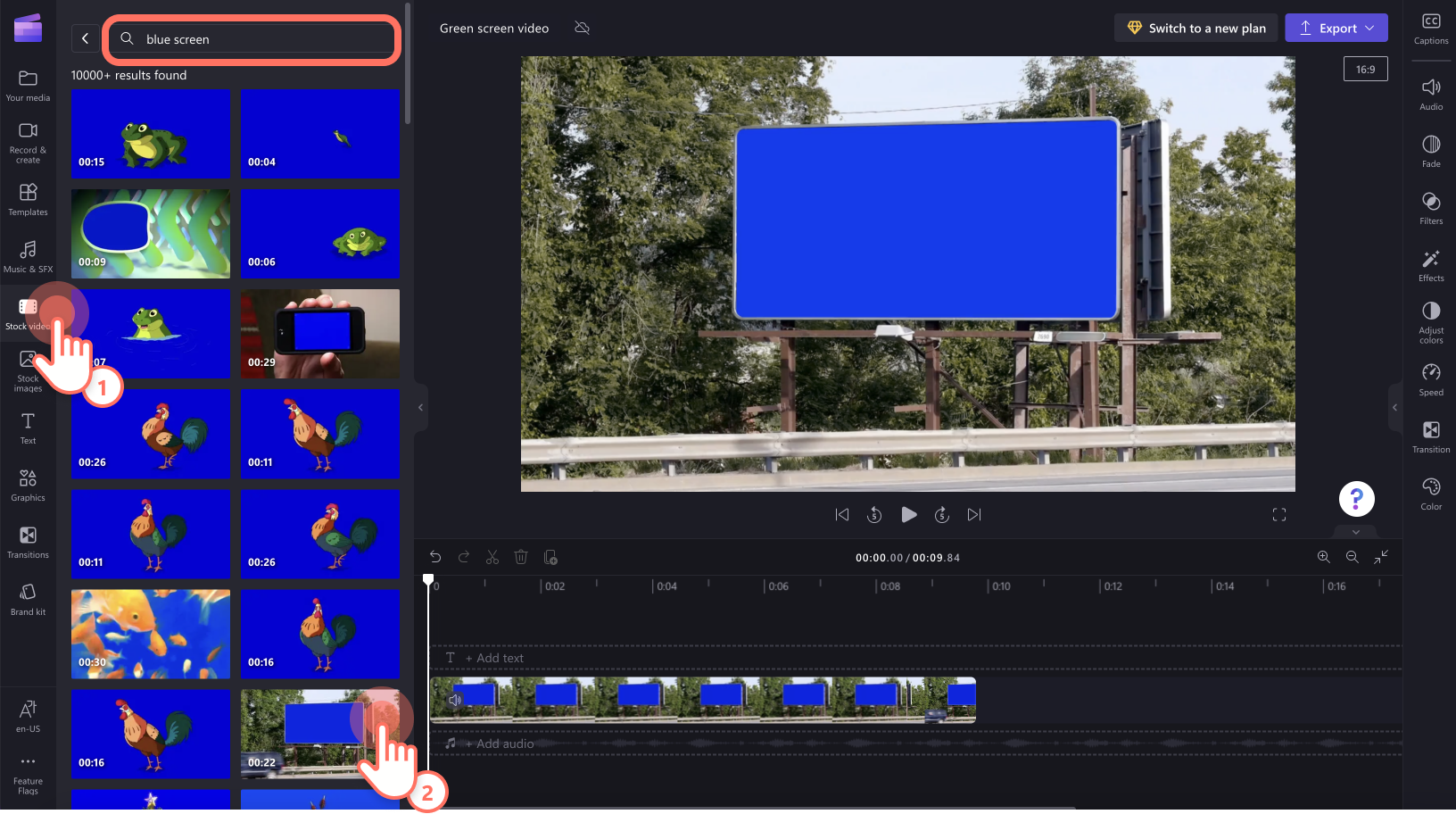 Откройте вкладку«Стоковое видео» на панели инструментов. Пролистайте варианты, пока не найдете категорию «Для зеленого фона». Выполните поиск по стоковым видеороликам.