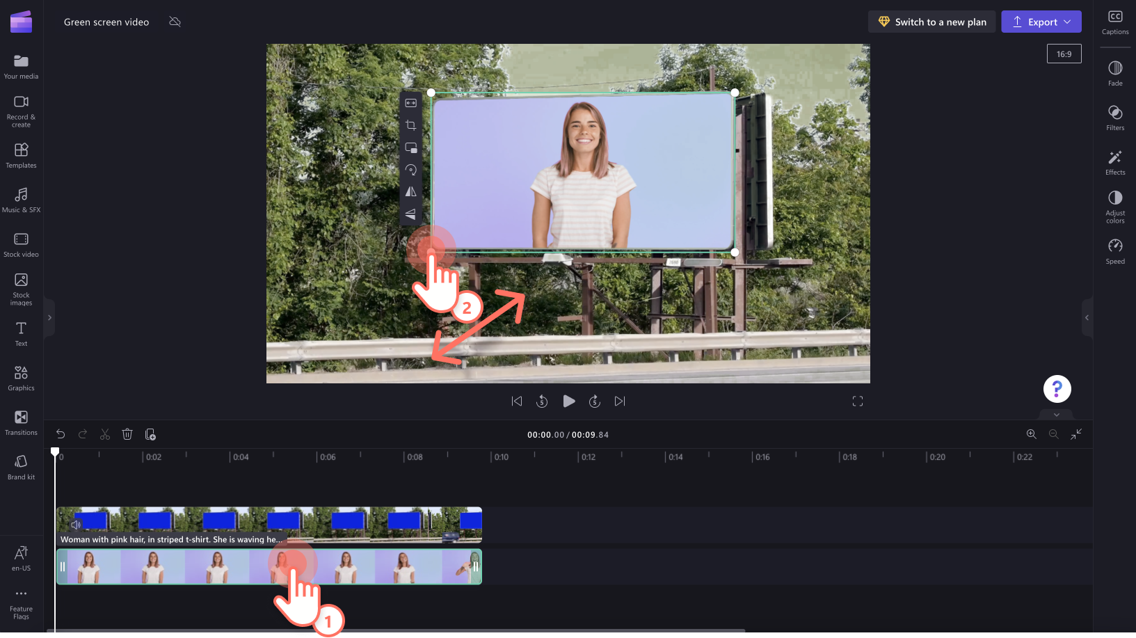 Если ваше видео больше, чем участок синего или красного фона, просто измените размер и положение ролика. Для этого выделите его на шкале времени (редактор подсветит его зеленым). Затем, чтобы изменить размер, потяните углы ролика внутрь или наружу. Используйте инструмент редактирования от руки, чтобы перетащить ролик на нужный участок экрана предварительного просмотра.
